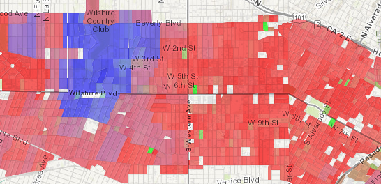 In the image below, the blue features represent areas that predominantly contain owner-occupied housing while the red features are mostly composed of renter-occupied housing units. Areas shaded with a light purple color, however, are composed of a near-even mix of owner-occupied and renter-occupied housing units. Thus areas with a high occurrence of one attribute will be rendered with strong opposing colors (in this case blue or red) while areas with nearly equal occurrences of the opposing attributes will blend the opposing colors (in this case purple).