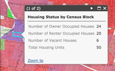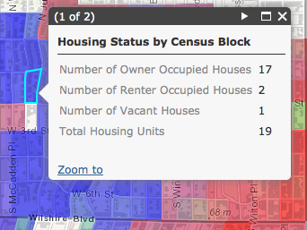 In the feature highlighted in the screenshot below, 17 out of the 19 housing units are owner occupied, therefore resulting in a strong blue color.