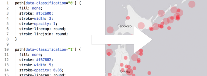 data-geometry-typeYou can also apply a style to features based on computed data-attributes. For instance, using the D3 JavaScript toolkit we can use the library's built-in scale method quantize to sort our data into "buckets" and then apply a style to each bucket. Here is a sample for adding computed data-attributes.