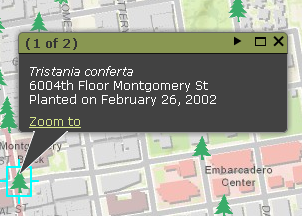 The PopupMobile class has several CSS classes that can be used to customize the popup appearance. Use the CSS title pane class to modify the color of the panel that appears when users click on a feature. In this example, the background color is modified to be dark gray color.