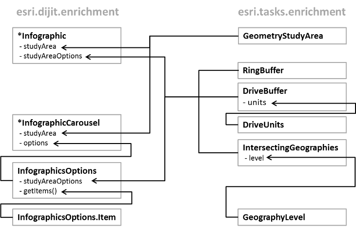 GeoEnrichment classes are placed under the esri.dijit.geoenrichment and esri.tasks.geoenrichment folders. Infographic and InfographicsCarousel provide basic user experience as demonstrated above, while other classes are used to support the constructor options of these two classes. The diagram below illustrates the relationships between the GeoEnrichment classes.