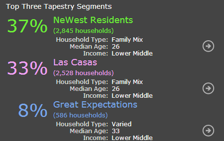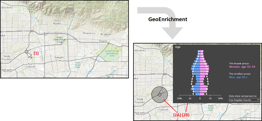 The GeoEnrichment widgets provide access to the ArcGIS GeoEnrichment Service via ArcGIS JavaScript API. Using GeoEnrichment, you can get information about the people, places, and businesses in a specific area or within a certain distance or drive time from a location. After executing a GeoEnrichment task, the widgets return either an Infographic or an InfographicsCarousel, where the information you requested is properly summarized and visualized in tables or/and charts.