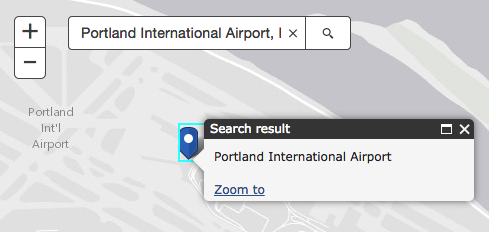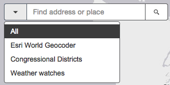 This widget wraps pre-built search functionality directly in it so all you need to do is reference it within your application. The widget defaults to the ArcGIS Online World Geocoding service if nothing is specified. It can also be customized to work with another defined locator. In addition to locators, the Search widget has the ability to search layers within your map and/or feature service. You specify how you wish the widget to work by using either a locator, feature layer(s), or both. These are considered sources of the widget and can be set in the