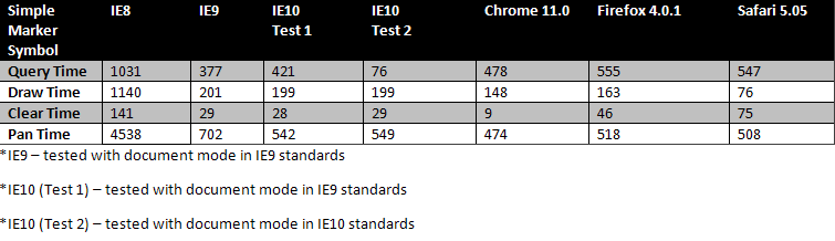 We created a simple test case that draws 1000 graphics on the map to test the performance improvements in Internet Explorer. This table shows the results of one test run, in milliseconds.