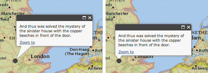 In the image above, pre-3.8 is shown on the left and the new style is shown on the right. The popup now uses a small beak in all locations whereas it previously used a longer callout when the popup was anchored to a location close to a corner of the screen.